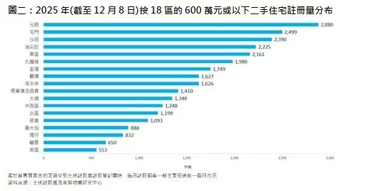若以香港18区划分,2025年(截至12月8日)600万港元或以下的二手住宅注册个案中,最多的3区悉数来自新界。其中,港元朗区全年录得2,880宗600万港元或以下注册,位列全港首位;屯门区则以2,499宗紧随其后,排第二位;沙田区录得2,390宗,位列第三。